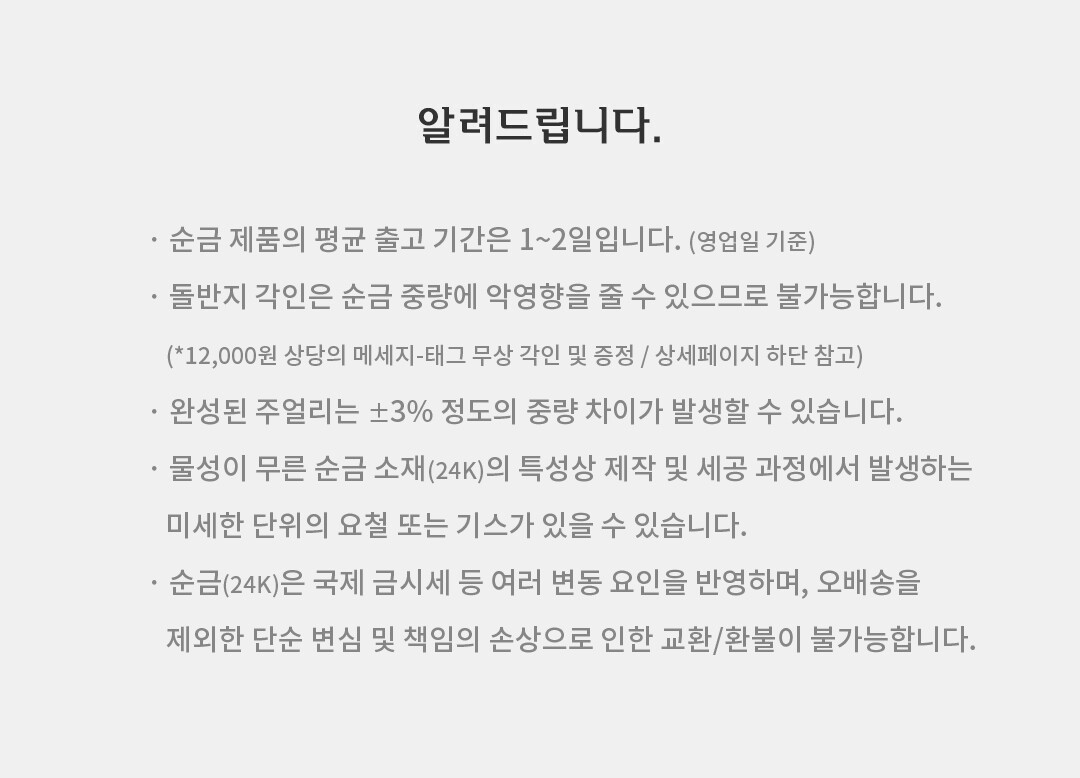 ②물성이 무른 순금(24K) 소재의 특성상 제작 및 세공의 과정에서 발생하는 몰드 자국, 기스, 요철 등이 있을 수 있습니다.